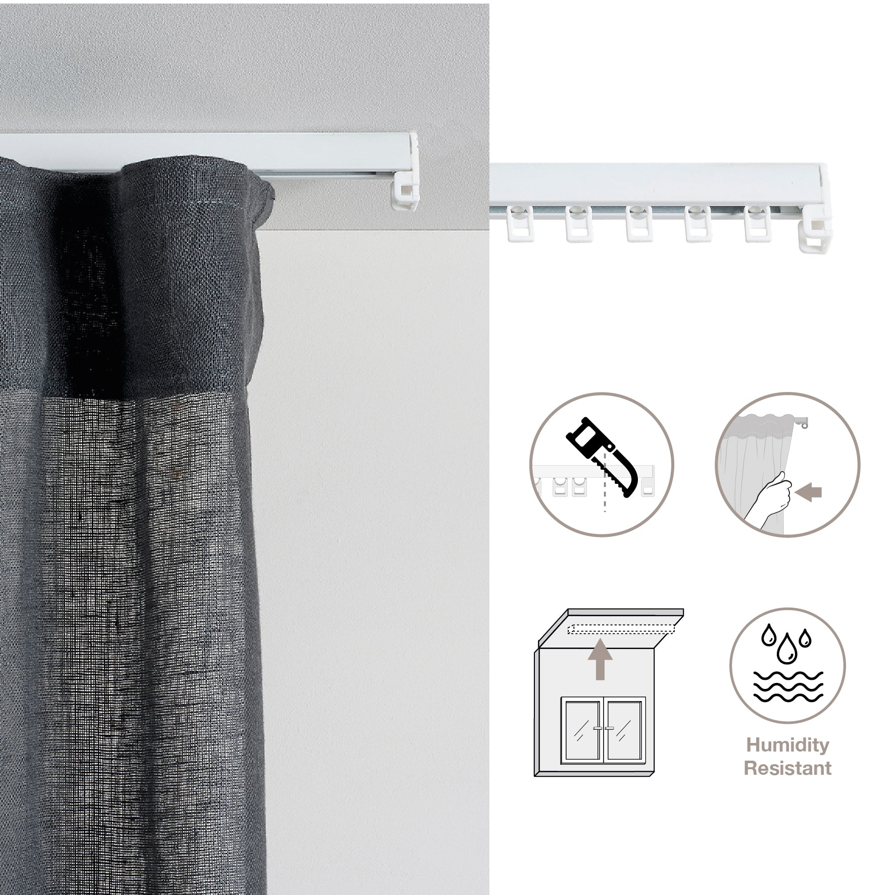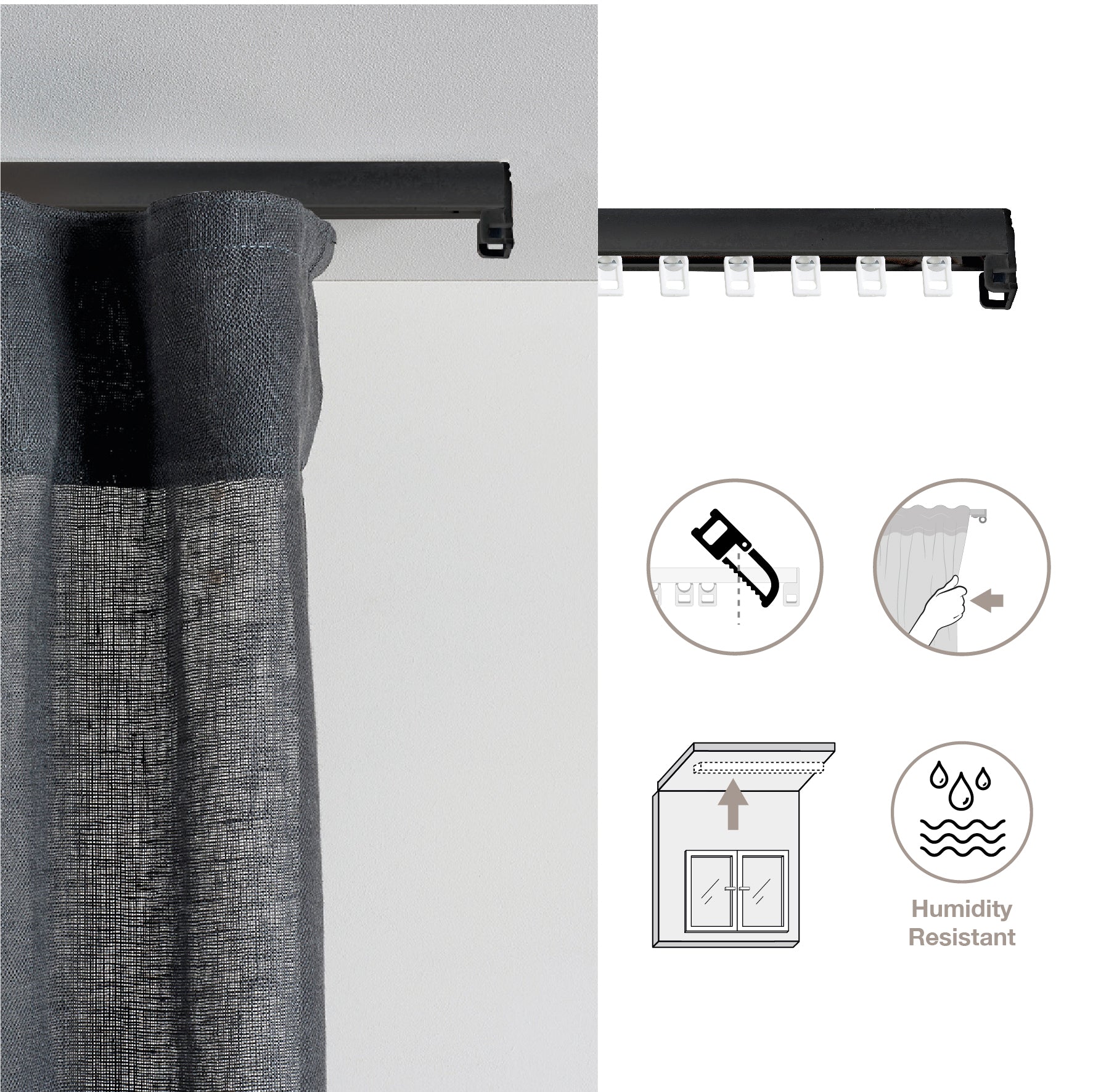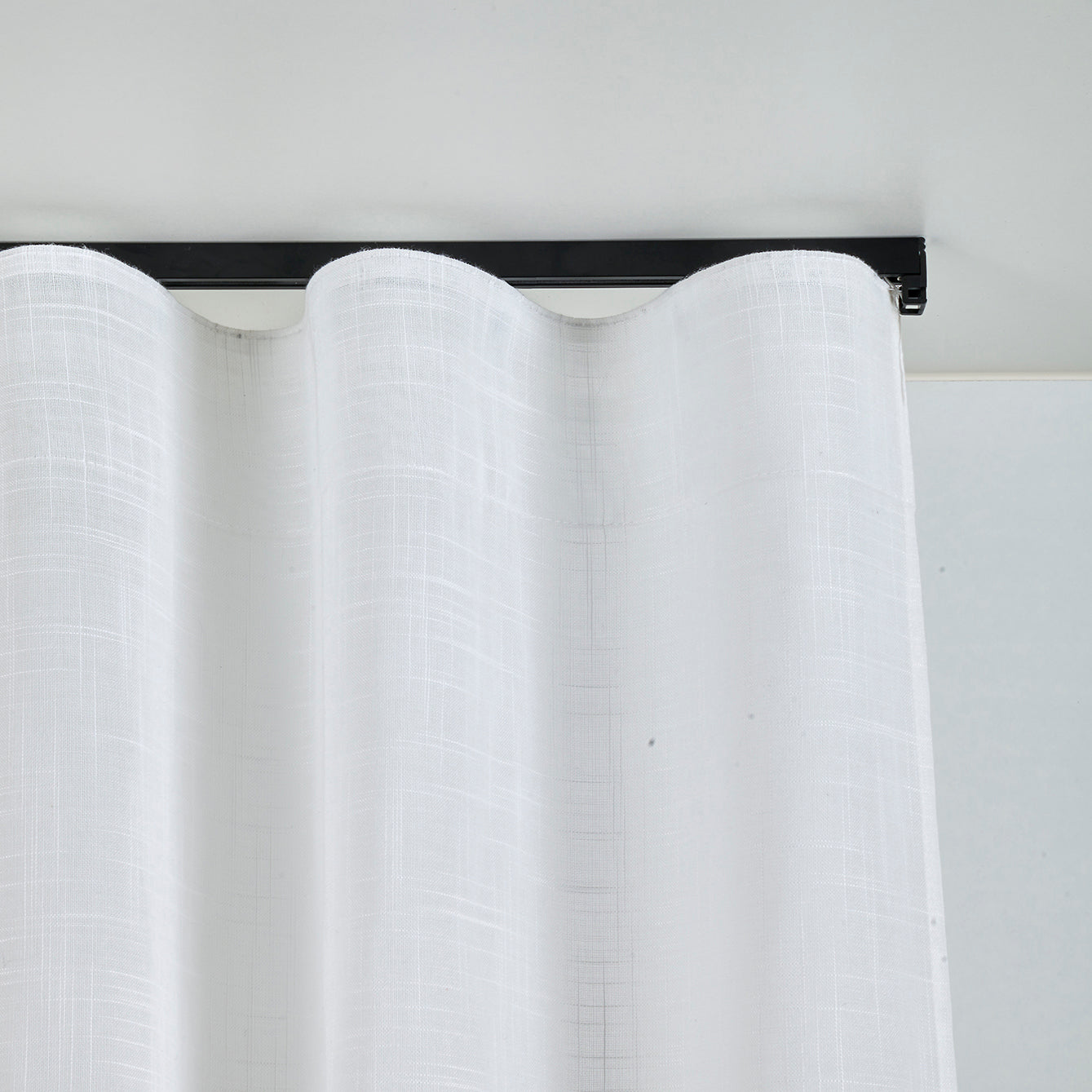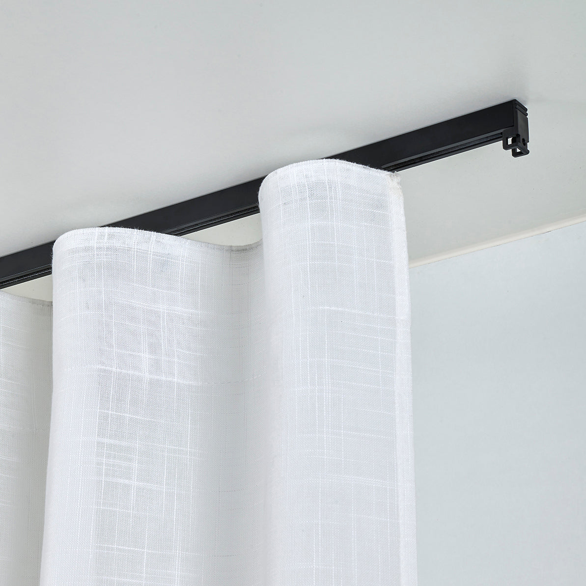 Disponible en deux finitions laquées : blanc, qui s'intègre visuellement aux plafonds clairs, et noir mat, qui apporte une touche élégante et moderne à l'ensemble avec le rideau.