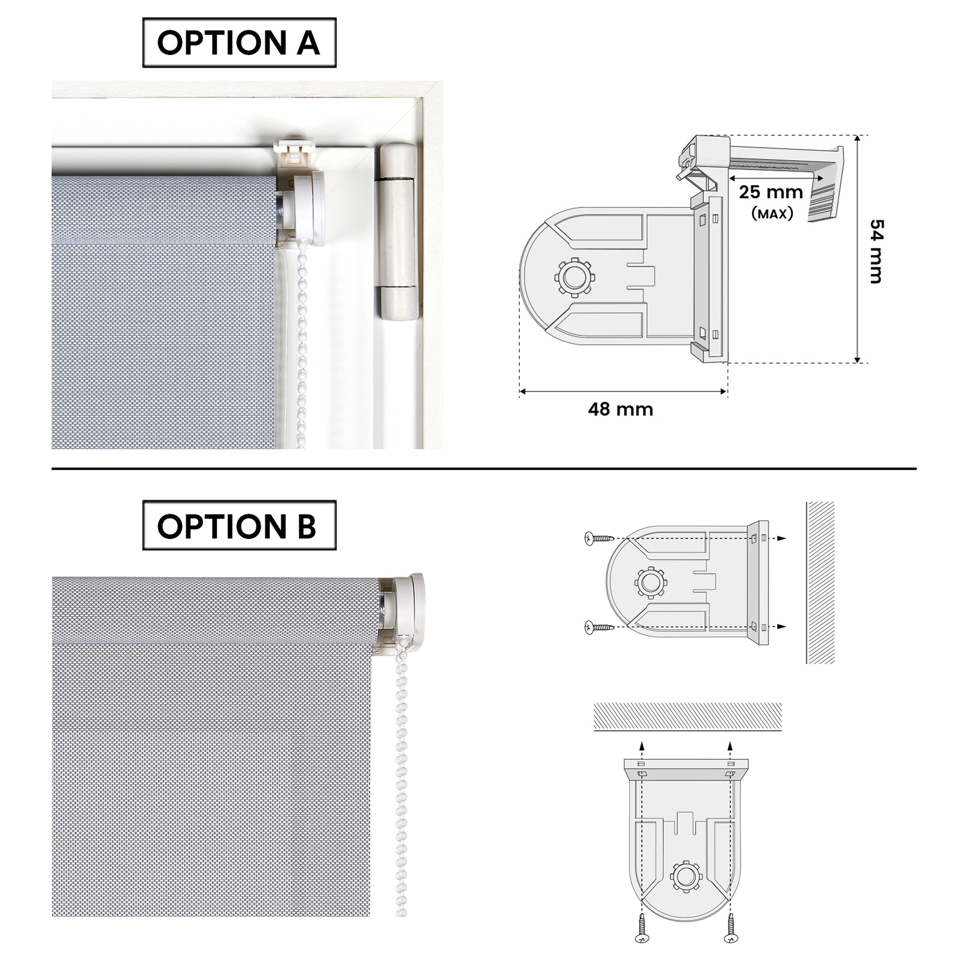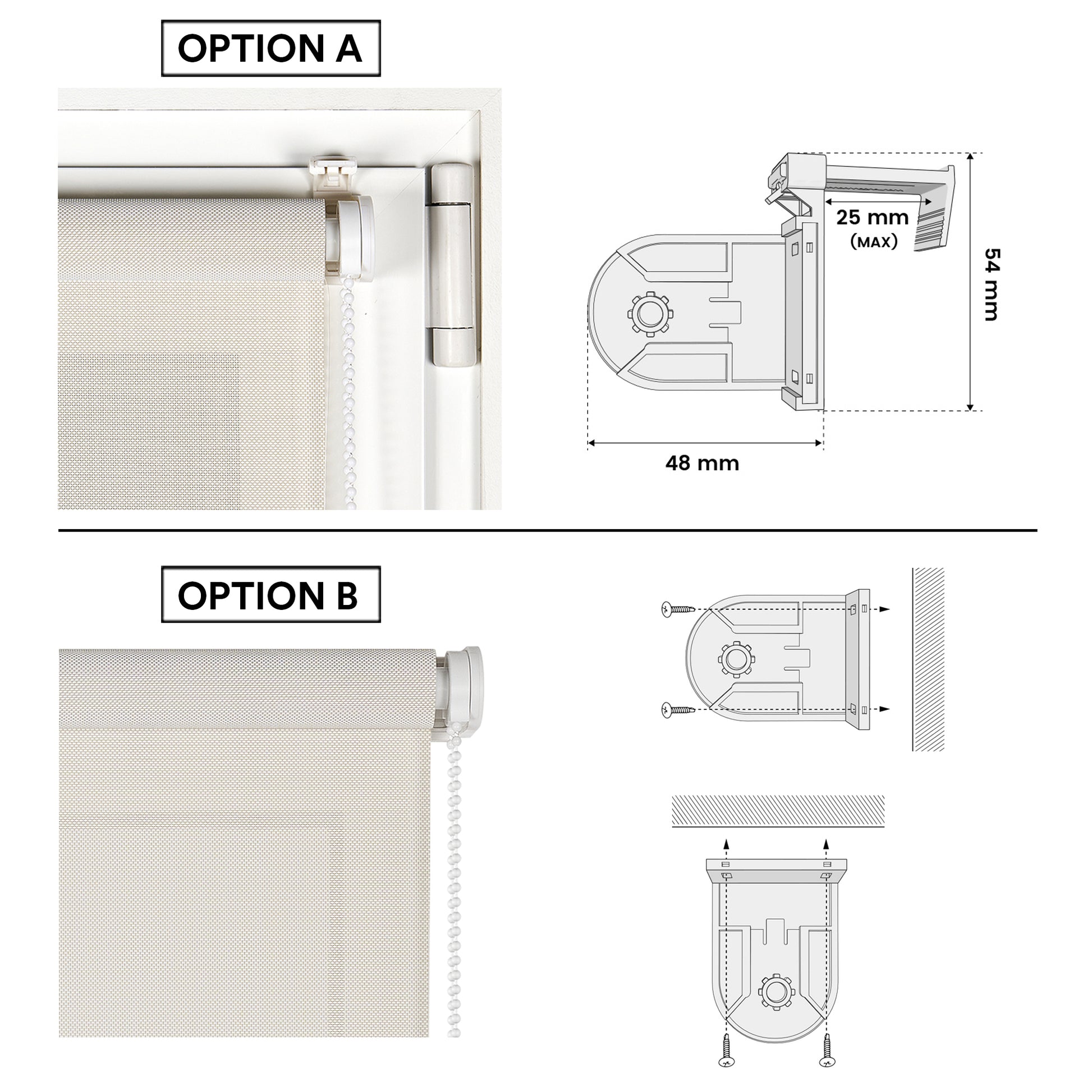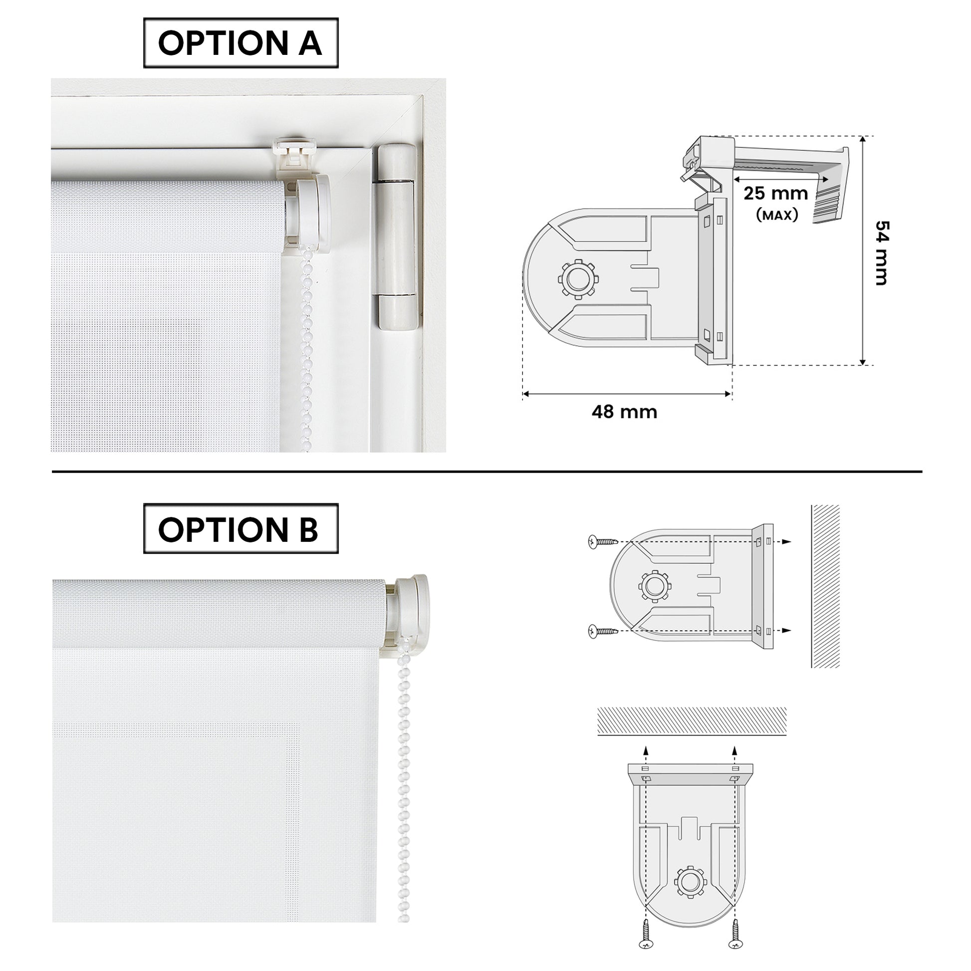 Il peut être installé sans outils et sans perçage sur le cadre de la fenêtre en aluminium ou en PVC. Comprend un système de blocage inférieur du store, en option.